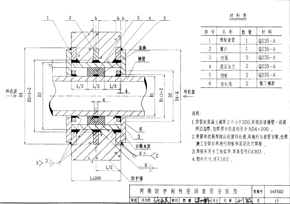 04FS02兩側(cè)防護(hù)剛性密閉套管適用于人防,地下工程,化工,鋼鐵,自來(lái)水,污水處理等管路穿墻壁要求嚴(yán)密防水之處。為了解決有些地下工程需要管路穿墻而過(guò),而通過(guò)處又有嚴(yán)密防水要求;還有些構(gòu)筑物也需要管路穿墻而過(guò),同時(shí)又限制管路不能因溫度變化或外力產(chǎn)生伸縮和位移,更不允許管路在外在因素作用下產(chǎn)生振動(dòng)而設(shè)計(jì)制作的。它的外殼一次性澆注在墻壁上,管子從套管中間通過(guò),管子外徑與套管中間用填料密封,起到了防水和減振作用。